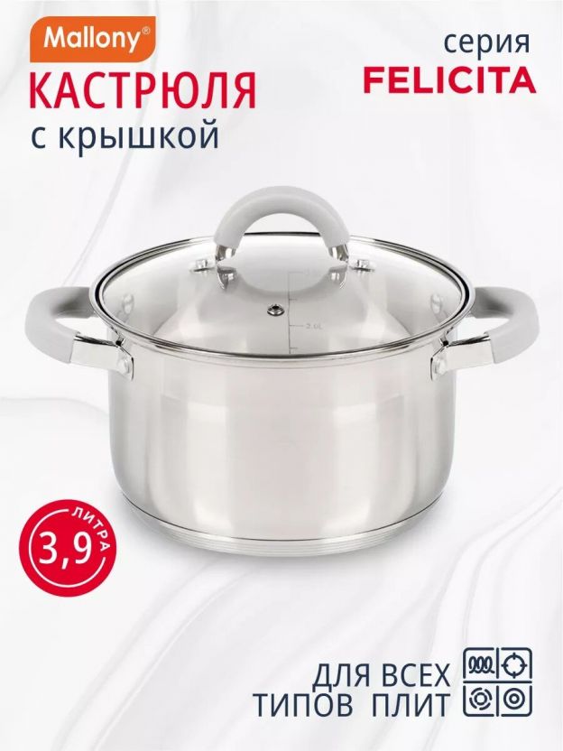 Кастрюля Mallony Felicit_ 3,9 л: идеальное решение для кухни — нержавеющая сталь, стеклянная крышка, силиконовые ручки, подходит для всех плит.