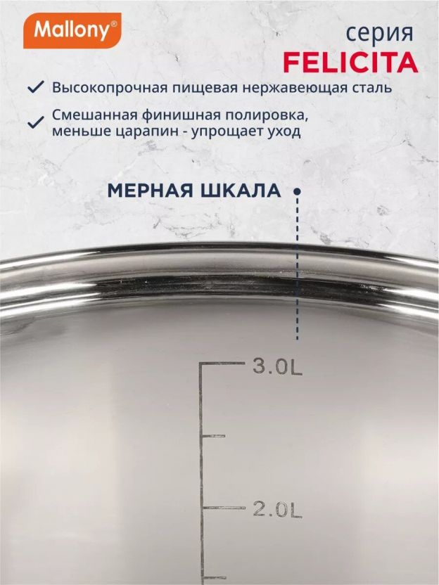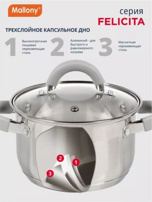 Если вы ищете, что лучше для подарка или семейного использования, обратите внимание на Mallony Felicit_: оптимальный объем, современный дизайн и гарантия производителя 12 месяцев делают эту кастрюлю выгодной покупкой. Закажите сейчас — получите быструю доставку и уверенность в качестве кухонной посуды.