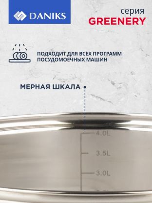 Ищете, какую кастрюлю выбрать для индукционной плиты или как подобрать оптимальный объём для семьи? Daniks Гринери — это современная кастрюля из нержавеющей стали с вместимостью 4,5 литра, подходящая для газовых, электрических, стеклокерамических и индукционных плит. Капсульное дно толщиной 0,4 мм обеспечивает равномерный нагрев, а мерная шкала внутри позволяет точно отмерить воду для супа, макарон или каши. В отличие от аналогов без силиконовых ручек, эта модель максимально безопасна: ручки не скользят и не нагреваются, что важно при частом использовании.
