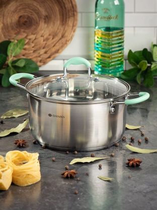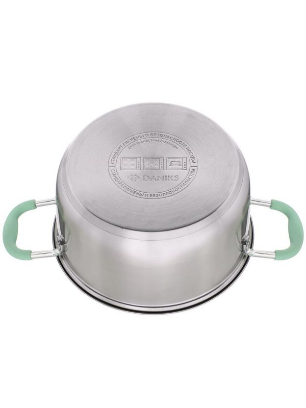 Кастрюля Daniks Гринери 4.5 л из нержавеющей стали с мятными силиконовыми ручками — универсальное решение для индукционных и газовых плит, идеально для семьи и дачи.