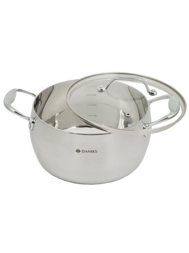 Кастрюля из нержавеющей стали 4.7 л Daniks Manola — оптимальный выбор для индукции и любых плит, с мерной шкалой и стеклянной крышкой для идеальных домашних блюд.