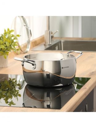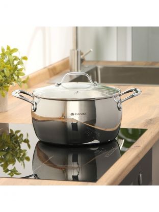 Кастрюля Daniks Manola объёмом 4.7 литра — это современное решение для тех, кто ищет, какую кастрюлю выбрать для индукционной плиты или универсального использования на газу, стеклокерамике и других поверхностях. Толстое дно, тройные стенки и марка стали 304 обеспечивают быстрый и равномерный нагрев без деформации, а зеркальная полировка придаёт эстетичный вид и облегчает уход. Если вы спрашиваете, чем отличается эта кастрюля от аналогов, обратите внимание на удобную мерную шкалу, выпускной клапан на крышке и возможность мытья в посудомоечной машине — это редкое сочетание в данном ценовом сегменте.