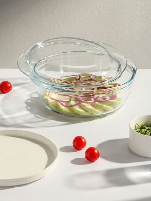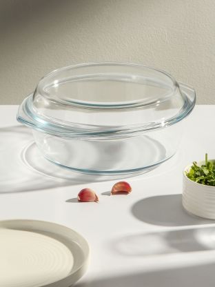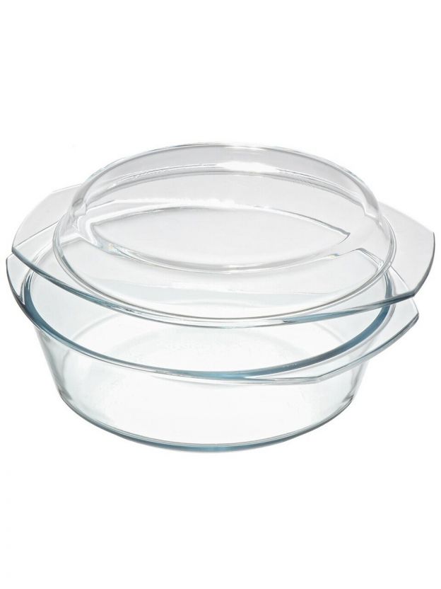 Объем 2.5 литра, размеры 29х25х10.4 см, диаметр 24 см. В комплекте крышка, подходит для запекания и разогрева.