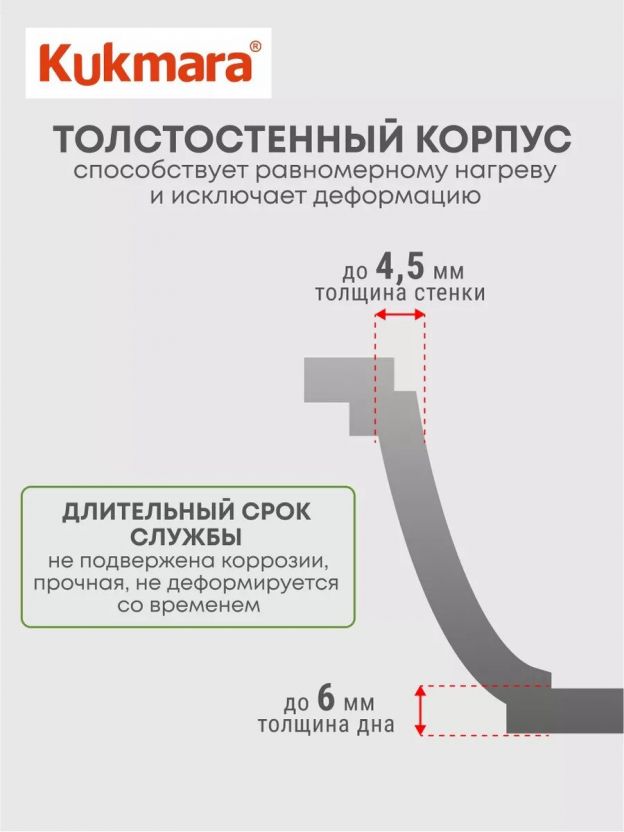 - Объем 4 литра, диаметр 26 см, толстое дно 6 мм — равномерный нагрев, сохранение тепла, долговечность корпуса из алюминия