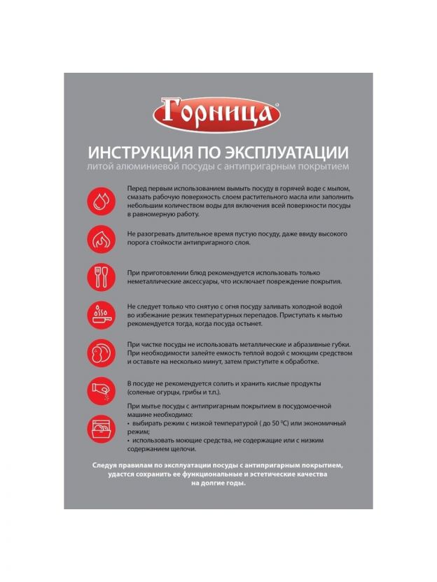 Одним из множества преимуществ литой алюминиевой посуды является экономия электроэнергии за счет необычайной теплоемкости алюминия. Утолщенное дно 5-6 мм и стенки 3,8-4,2 мм посуды ООО «Горница» при равномерном распределении тепла по всей поверхности посуды обеспечивают необходимый температурный режим, который позволяет приготовить вкусную и здоровую пищу, сохраняя при этом все полезные витамины и свойства продуктов.