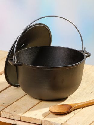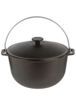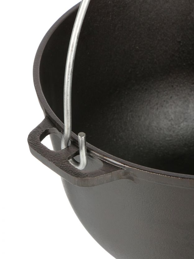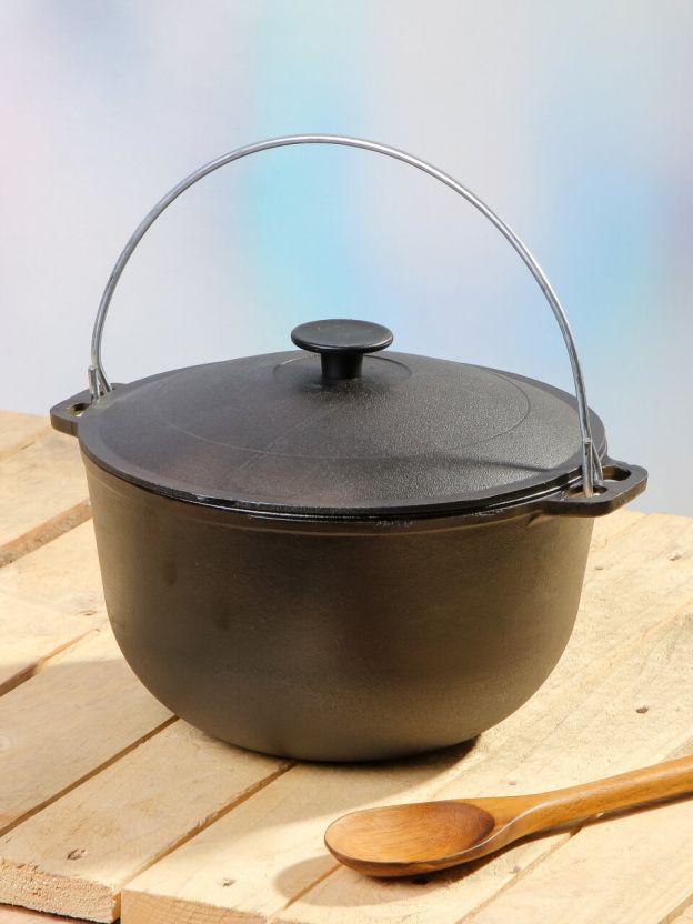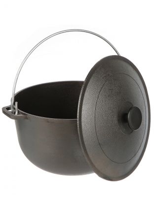 Объём 6 литров — оптимально для приготовления на 5-8 персон. Чугунная крышка и дужка входят в комплект, что удобно для переноски и готовки на костре.