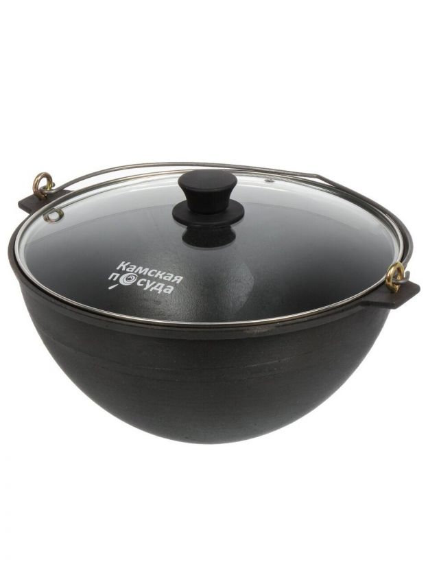 Казан чугун, 7 л, с крышкой, крышка стекло, с дужкой, Камская посуда, к72д