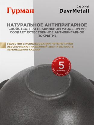Выбирая узбекский чугунный казан от бренда Гурман, можно быть уверенными в его надежности и долговечности. Это инвестиция в качество и вкус, которая окупится с первых же приготовленных блюд. Порадуйте себя и своих близких настоящими кулинарными открытиями! Обратите внимание: перед первым применением казан необходимо прокалить согласно инструкции.