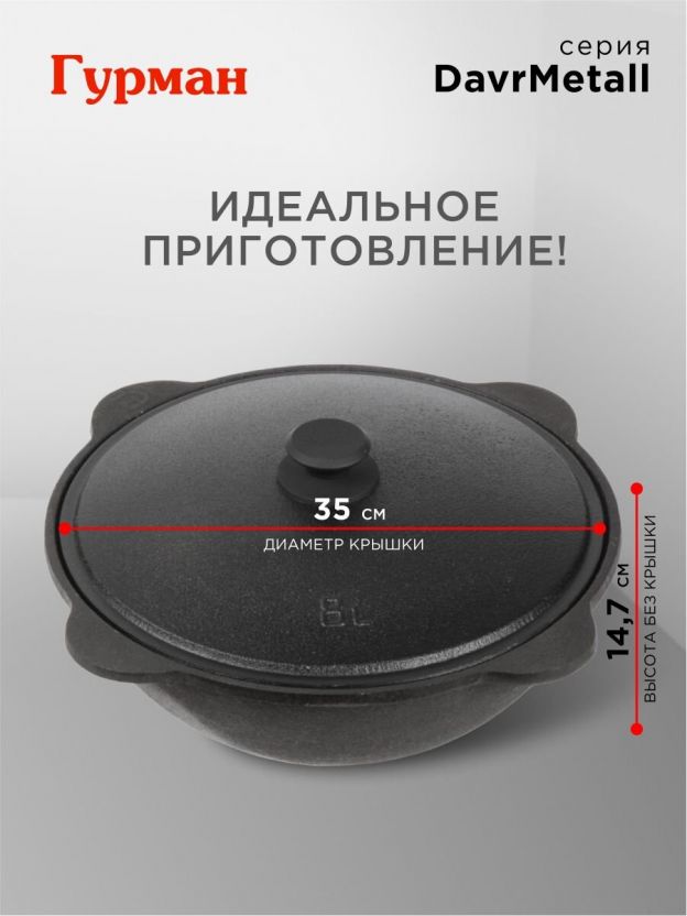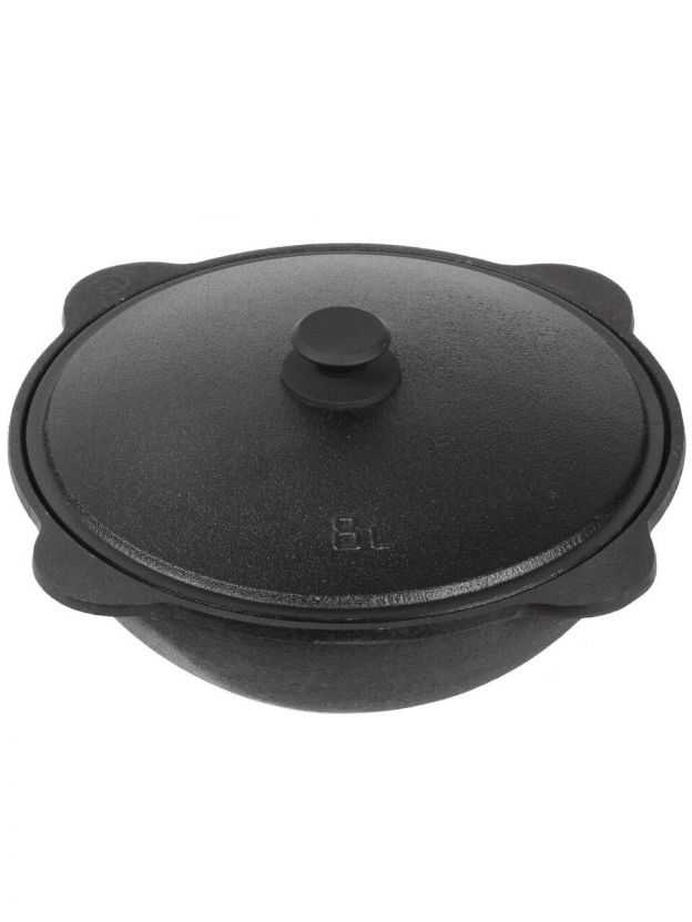 Казан узбекский чугун, 8 л, DavrMetall, с крышкой, крышка алюминий, плоское дно, Гурман