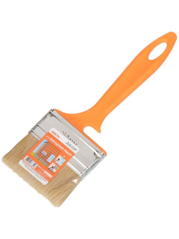Кисть применяется для фасадных работ. Кисти разработаны для работ с большими площадями. Продукт выполнен из густой, плотной набивки по сравнению с прочими кистями. Щетина выполнена из натурального волокна. Рабочая часть надежно закреплена бандажом из стали. В пластиковой рукоятке имеется отверстие для подвешивания и специальный крючок для крепления на банку.