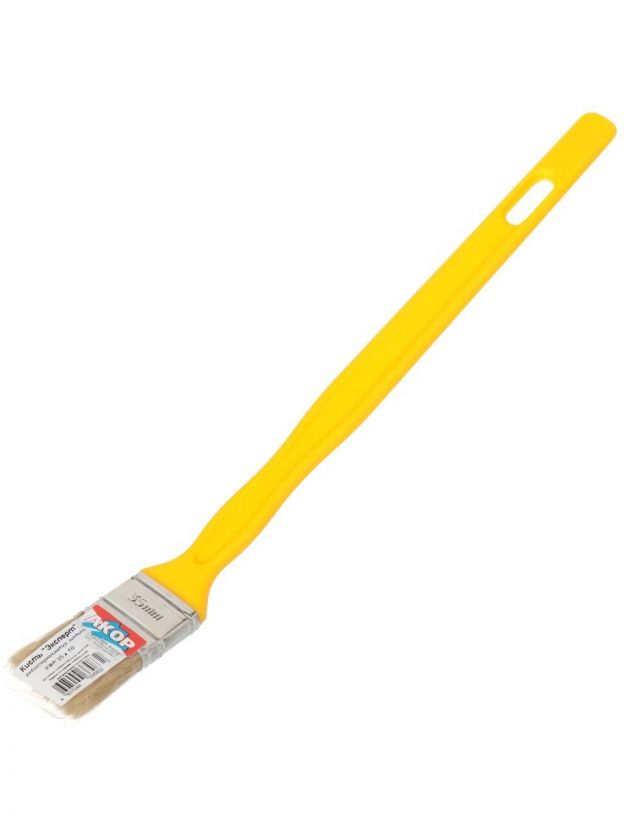 Плоская кисть Акор - ручной малярный инструмент с удлиненной пластиковой ручкой и со светлой натуральной щетиной. Используют для нанесения лакокрасочных материалов на поверхности радиаторов.