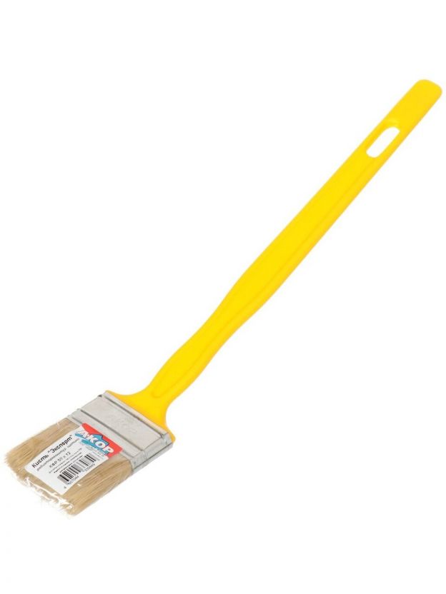Плоская кисть Акор - ручной малярный инструмент с удлиненной пластиковой ручкой и со светлой натуральной щетиной. Используют для нанесения лакокрасочных материалов на поверхности радиаторов.