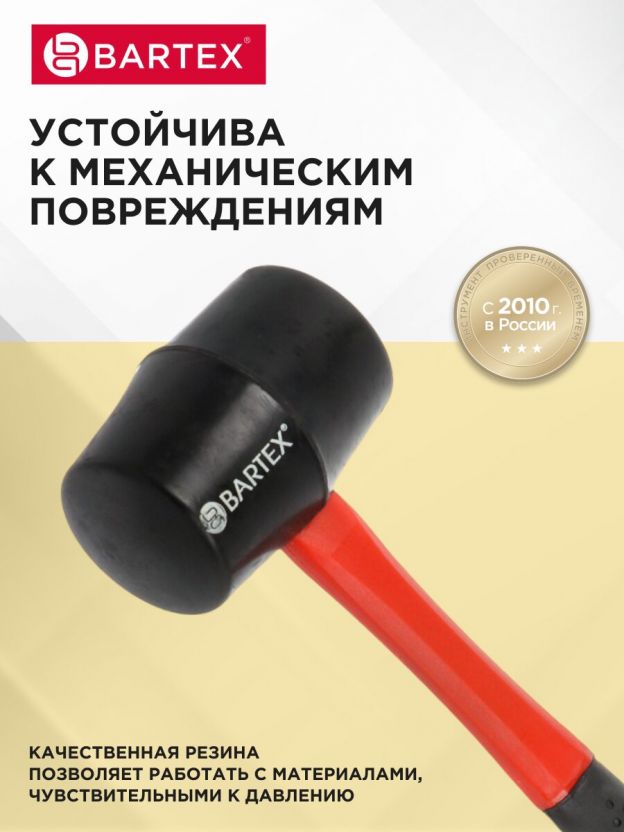 Киянка — распространенная разновидность ручного ударного инструмента, состоящая из длинной ручки и ударной головки. Киянка Bartex имеет особую фиберглассовую обрезиненную рукоятку, которая обладает высокой прочностью и эластичностью. Она устойчива к воздействию органических растворителей, а также не подвержена рассыханию и набуханию, что позволяет хранить инструмент в любых условиях. Ударная головка киянки выполнена из черной резины, обладающей твердостью 75 единиц по Шору.