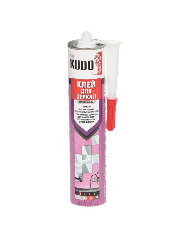 Высококачественный однокомпонентный клей «жидкие гвозди» KUDO на каучуковой основе специально разработан для приклеивания зеркал на поверхности из металла, древесины, ДСП, ДВП, кирпича, камня и различных видов пластика. Клей характеризуется высокой первоначальной силой схватывания, не стекает с вертикальных поверхностей, не содержит агрессивных растворителей и безопасен для амальгамы. Модель KBK-410 пригодна для склеивания изделий из деликатных материалов.