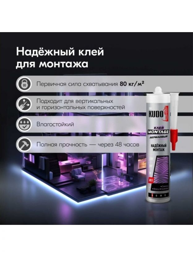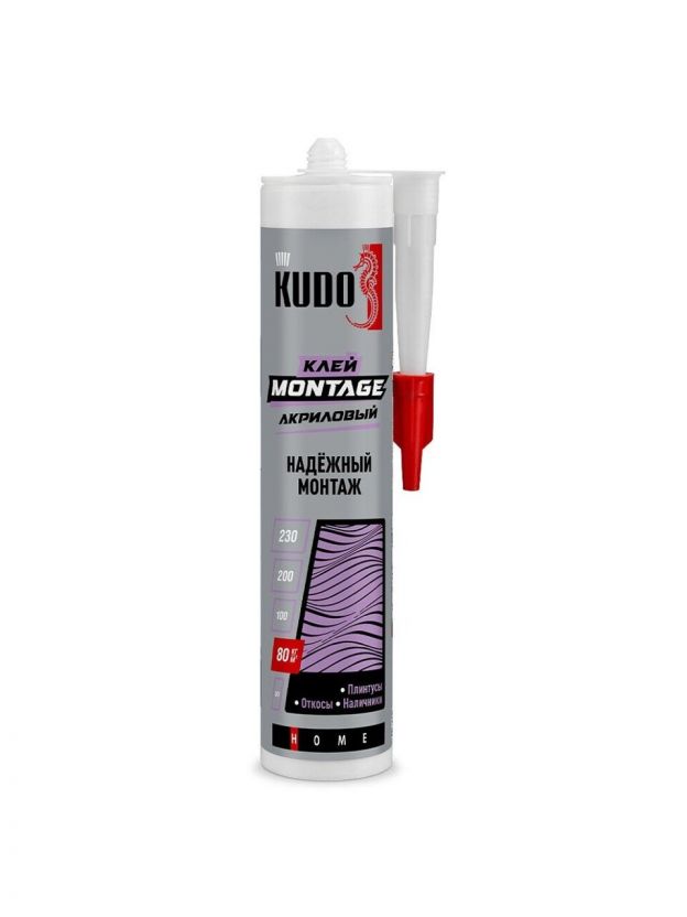 Белый акриловый монтажный клей KUDO представляет собой высококачественный состав, предназначенный для широкого спектра монтажных и ремонтных работ. Клей обладает отличной адгезией к большинству строительных материалов, таких как дерево, кирпич, бетон, штукатурка, керамическая плитка, гипсокартон и другие. Благодаря своей эластичности и прочности, клей обеспечивает надежное и долговечное соединение элементов. Рекомендуется для монтажа плинтусов, откосов, наличников и т.д.