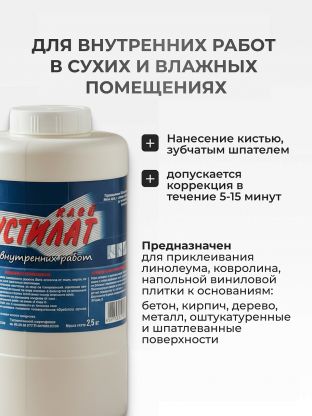 Клей предназначен для напольных покрытий для приклеивания ковролина, линолеума, напольной виниловой плитки к бетонным, кирпичным, оштукатуренным и шпатлеванным поверхностям, дереву и металлу. Применяется для внутренних работ в сухих и влажных помещениях.
