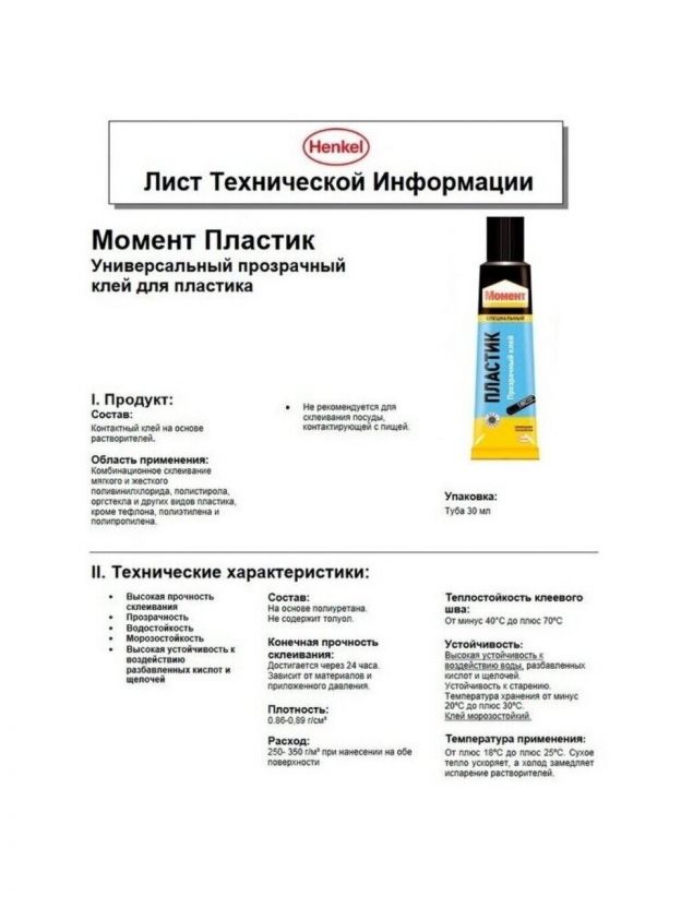 Области применения: склеивание мягкого и жесткого поливинилхлорида, полистирола и оргстекла. Не пригоден для склеивания тефлона, полиэтилена или полипропилена.