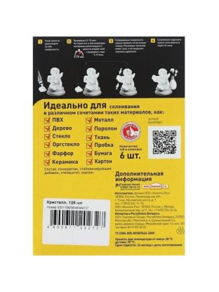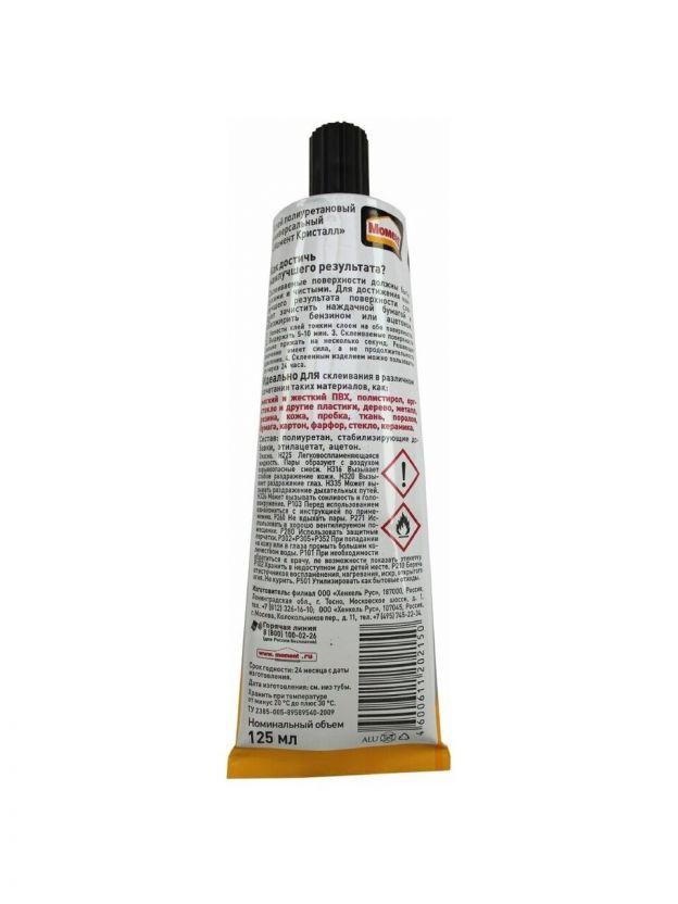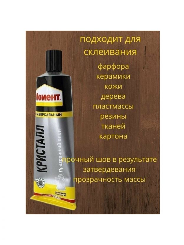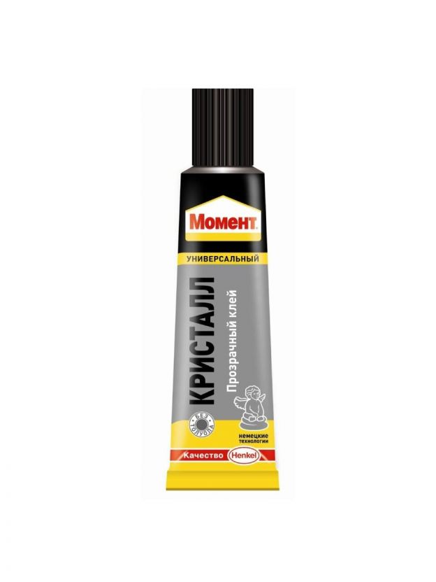 Момент Кристалл особенно хорошо подходит для склеивания мягкого и жесткого поливинилхлорида, полистирола, оргстекла и других пластиков, в различных сочетаниях склеивает дерево, металл, резину, бумагу, картон, полиуретан, пробку, поролон, фарфор, керамику, стекло, кроме посуды, контактирующей с пищей. Не подходит для стиропора, полиэтилена и полипропилена. Является прозрачным, водостойким, обеспечивает высокую прочность склеивания.