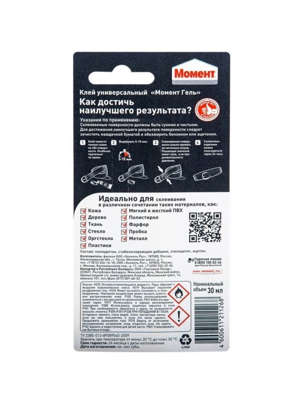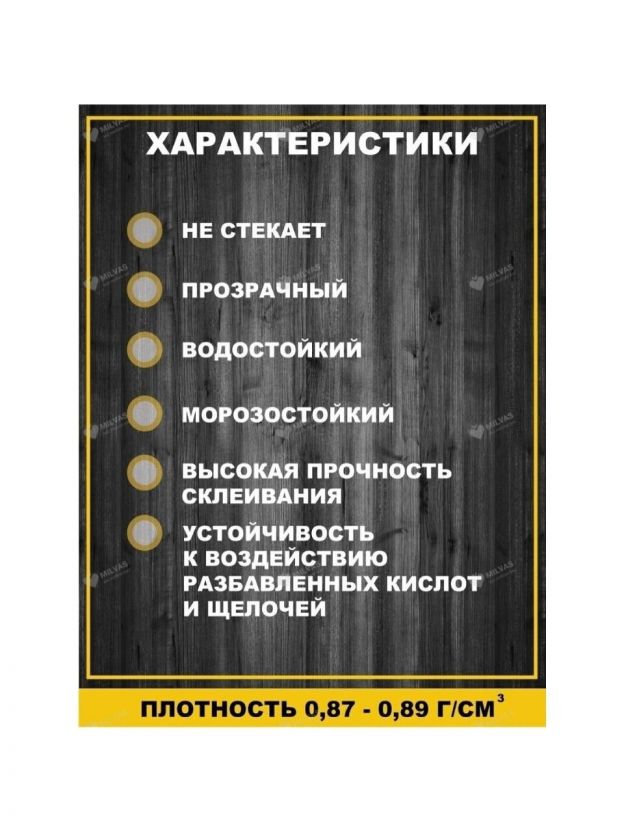 Клей идеально подходит для комбинационного склеивания мягкого и жесткого ПВХ, полистирола, оргстекла и других пластиков, дерева, резины, кожи, пробки, ткани, поролона, бумаги, картона, стекла, фарфора, керамики, вспененных материалов, металлов и многих других материалов. Данный клей имеет гелеобразную консистенцию, является прозрачным, водостойким. Легко наносится: не растекается, не капает. Обеспечивает высокую прочность склеивания