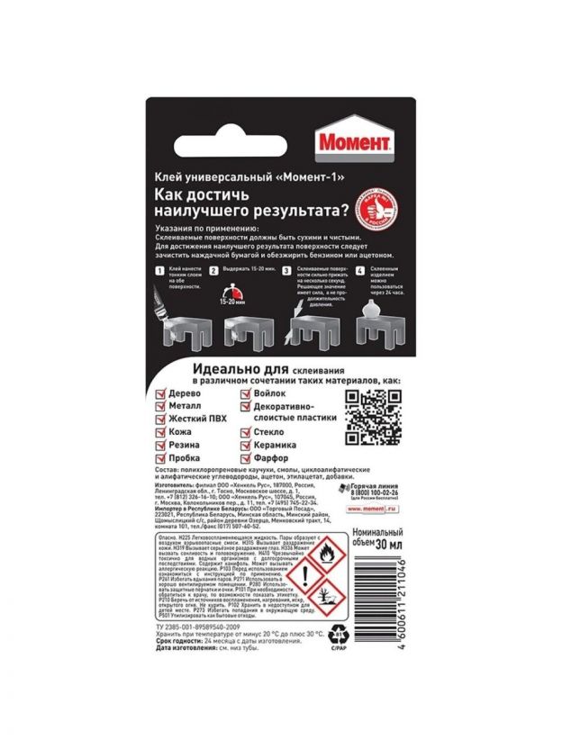Идеально подходит для склеивания в различном сочетании дерева, металла, жесткого поливинилхлорида, кожи, резины, войлока, декоративно-слоистых пластиков, стекла, керамики, фарфора. He пригоден для склеивания посуды, контактирующей с пищей.