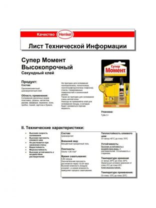 Супер Момент Высокопрочный является универсальным секундным клеем в форме геля, отлично подходит для соединения различных материалов. Водостойкий и термостойкий, обладает повышенной прочнойстю клеевого шва. Быстрый, прозрачный, не растекается.