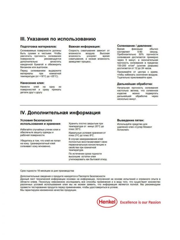 Области применения: Склеивание различных видов пластмасс, резины, металлов, дерева, фарфора, керамики, кожи, пробки, тканей, картона и бумаги. Не пригоден для склеивания полипропилена, полиэтилена, политетрафторэтилена (тефлона), стекла, глазированных поверхностей и силиконовой резины. Также не пригоден для склеивания очень мягкой кожи. Не применим для склеивания посуды, в которую будет наливаться горячая жидкость и посуды, которая может контактировать с пищей.