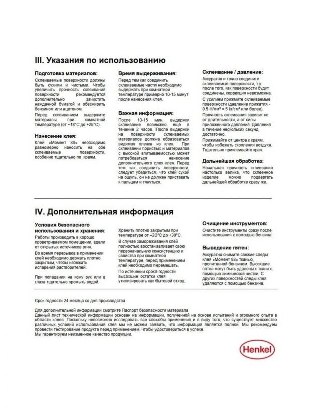 Клей предназначен для склеивания резины, кожи, металлов, полистирола, оргстекла и др. пластиков, пробки, стекла, керамики, бетона. Не подходит для склеивания посуды, контактирующей с пищей, стиропора, полиэтилена и полипропилена. Уникальная формула клея обеспечивает особо высокую прочность клеевого соединения. Является теплостойким и водостойким.