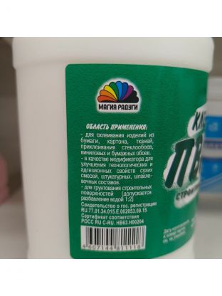 Данный клей применяется для склеивания изделий из бумаги, картона, тканей, приклеивания стекловолоконных, виниловых и бумажных обоев. Может использоваться в качестве модификатора для улучшения технологических и адгезионных свойств сухих строительных смесей, штукатурных, шпатлевочных составов или для грунтования строительных поверхностей.