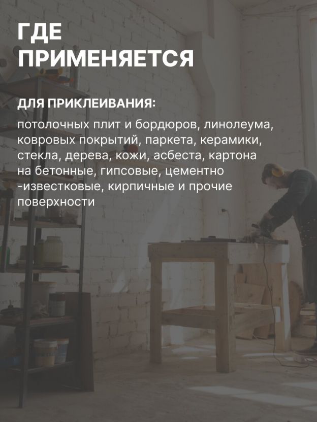 Применяется для приклеивания потолочных плит, потолочных бордюров и других изделий из полистирола, линолеума, ковровых покрытий, паркета, керамики, стекла, дерева, кожи, асбеста, картона на бетонные, гипсовые, цементно-известковые, кирпичные и прочие поверхности, а также для склеивания между собой в различных комбинациях.