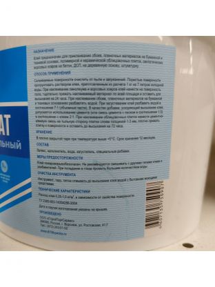Представленный клей производится из винилового латекса, мела, загустителя, модифицированной целлюлозы, воды, консерванта и многих других специальных добавок. Консистенция сметанообразная. Состав не боится огня. Относится к прочному на отрыв экологически чистому и огнебезопасному клеящему составу. Перед нанесением клея, поверхность необходимо подготовить, очистить от загрязнений, высушить.