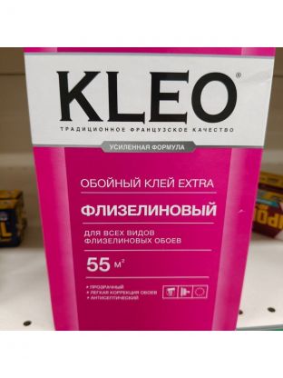 Клей Kleo Extra предназначен для всех видов флизелиновых обоев, виниловых обоев на флизелиновой основе и малярного флизелина. Обладает усиленной формулой состава, изготовлен на основе модифицированного крахмала и противогрибковых добавок. Получаемый раствор обойного клея не содержит посторонних включений, а также мела или извести.