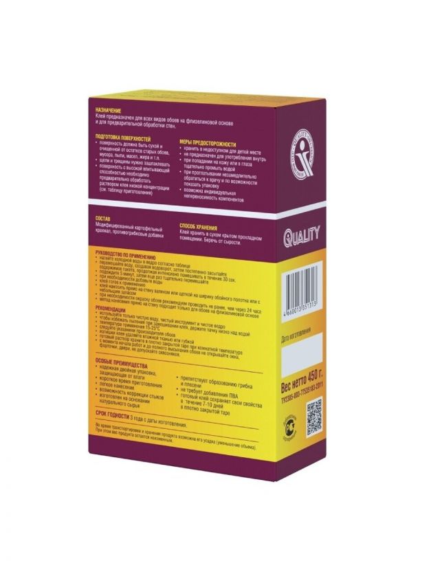 Ищете надежное решение для поклейки флизелиновых обоев? Клей для флизелиновых обоев Quality — идеальный выбор для качественного результата. Этот продукт обеспечивает надежное сцепление и долговечность покрытия, что делает его незаменимым помощником в ремонте.
