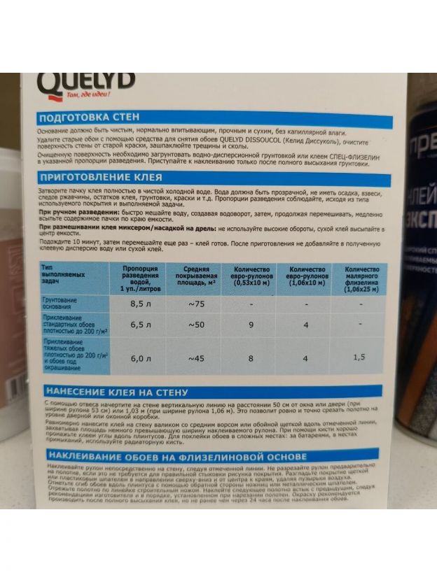 Ищете надежное решение для поклейки флизелиновых обоев? Клей для флизелиновых обоев Quelyd "Спец-Флезилин" - идеальный выбор для качественного ремонта. Этот продукт обеспечивает надежное сцепление и долговечность покрытия, что делает его незаменимым помощником в создании уютного интерьера.