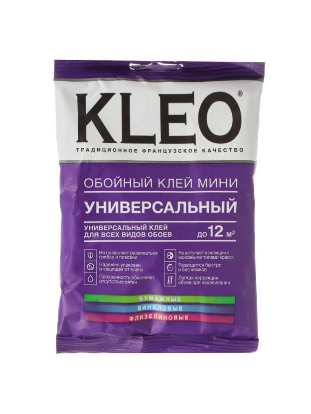 Клей KLEO Мини - универсальный клей, предназначенный для всех видов флизелиновых, виниловых и бумажных обоев. Обладает повышенной первоначальной схватываемостью, сохраняет прозрачность после высыхания и совместим со всеми типами оснований.