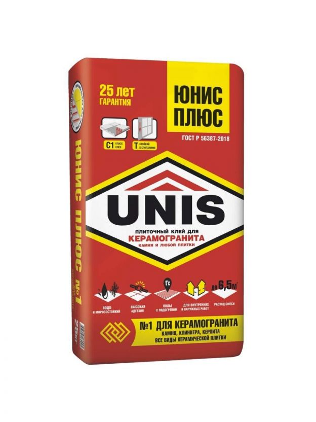 Клей «Юнис Плюс» используется для укладки керамической, кафельной и мозаичной плитки, плит из природного камня и керамогранита на пол и стены. Рекомендуется для наружной облицовки зданий выше цокольной части; плиточных работ во внутренних помещениях с нормальной и повышенной влажностью; для ванных комнат, балконов и террас, а также при облицовке поверхностей сложных оснований, таких как старые плиточные покрытия, нагреваемые поверхности и др.