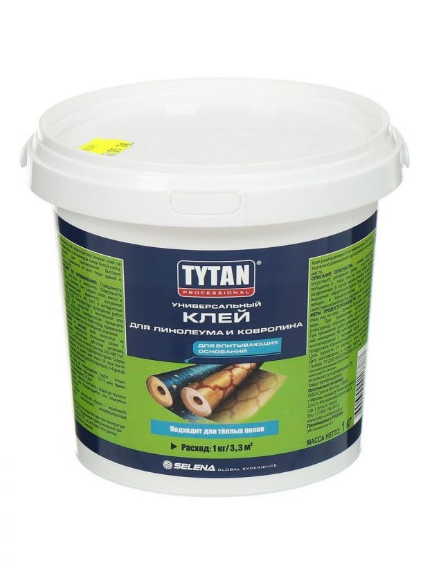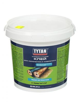Клей для линолеума и ковролина Tytan - высокоэластичный, однокомпонентный акриловый клей на водной основе. Предназначен для приклеивания линолеума, ковровых покрытий, виниловых плиток к бетонной стяжке, фанере, ДСП и МДФ в помещениях с большой динамической нагрузкой на напольные покрытия. Имеет высокий показатель прочности и эластичности. Не рекомендуется для наружных работ.
