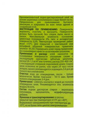 - Предназначен для приклеивания бытового линолиума и ковролина во всех типах зданий и сооружений (А-В).