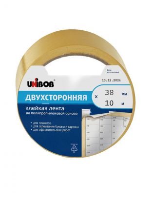 Клейкая лента 38 мм, двухсторонняя, основа полипропиленовая, 10 м, Unibob, 38566