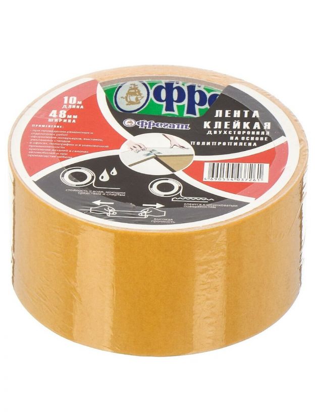 Клейкая лента 48 мм, желтая, двухсторонняя, основа полипропиленовая, 10 м, Фрегат, ПП4810