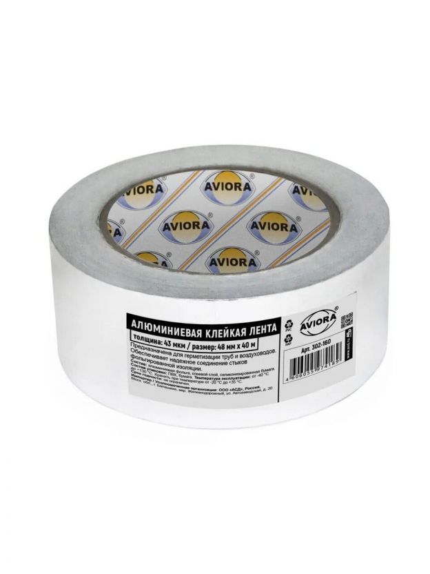 Клейкая лента алюминиевая 48 мм, основа фольга, 40 м, Aviora, DSAF 20 мкм, 302-160
