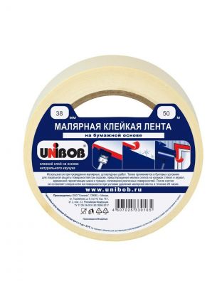 Клейкая лента малярная 38 мм, основа крепированная бумага, 50 м, Unibob, 28138