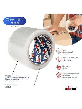 Клейкая лента упаковочная, 72 мм, прозрачная, основа полипропиленовая, 66 м, 45 мкм, Unibob, 600, 74778
