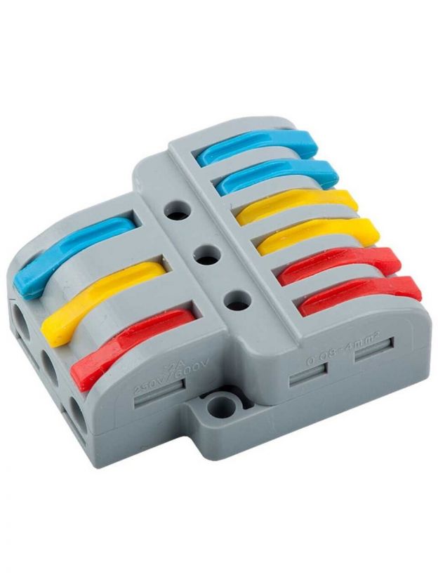 Клемма используется для соединения силовых проводов (одножильных или многожильных). Обеспечивает быстрый и надежный монтаж без использования пайки или изоленты. Зачищенные от изоляции провода просто вставляются в отверстия и прижимаются с помощью рычагов.