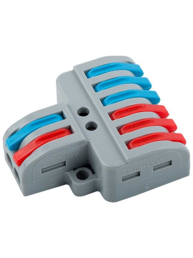 Клемма используется для соединения силовых проводов (одножильных или многожильных). Обеспечивает быстрый и надежный монтаж без использования пайки или изоленты. Зачищенные от изоляции провода просто вставляются в отверстия и прижимаются с помощью рычагов.