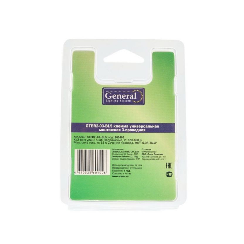 Клемма монтажная, универсальная, 3-проводная, уп. 5 шт, 0.08-4 мм2, General Lighting Systems, 800405