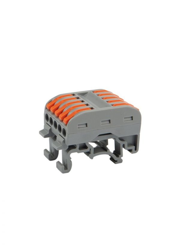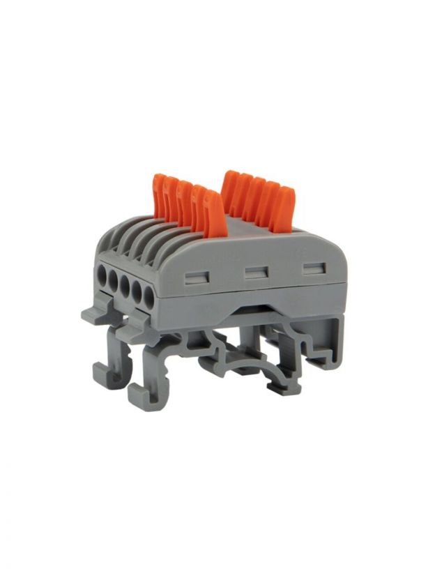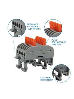 Клемма проходная СМК 222-425D, 10 отверстий, серая, 5-полюсная, с крепл. на DIN-рейку, 0.08-4 мм2, Rexant, 07-5236