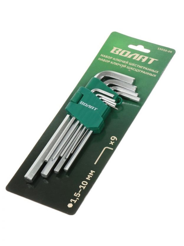 Ключ шестигранный, 9 предметов, Волат, 1.5-10 мм, никель, углеродистая сталь, длинный, 11010-09