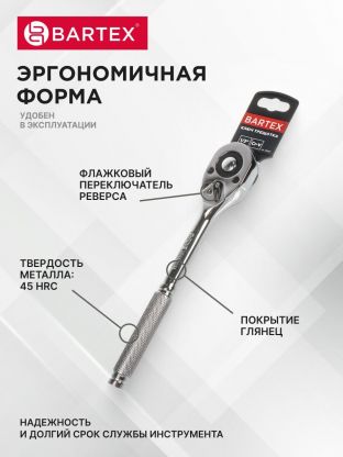 Трещоточный ключ Bartex – это отличный выбор, как для профессионалов, так и для домашних мастеров. Он обязательно пригодится Вам в быту: дома, в гараже или на даче. Даже спустя продолжительное время Ваши руки не почувствуют усталости, благодаря комфортному захвату. С ключом-трещоткой производительность труда возрастет в несколько раз, и Вы сможете наиболее эффективно работать даже с крупными болтовыми соединениями.