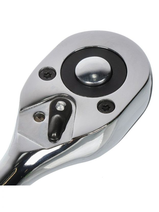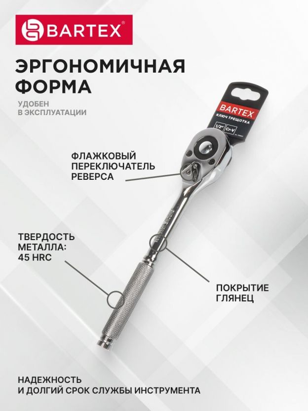 Ключ-трещотка Bartex незаменим при обслуживании автотранспорта, ремонте инженерных систем, монтаже и демонтаже крепежных элементов. Реверс легко переключается флажковым механизмом. Ключ позволяет как откручивать, так и закручивать гайку при помощи реверсивного устройства, не снимая его со сменной головки.