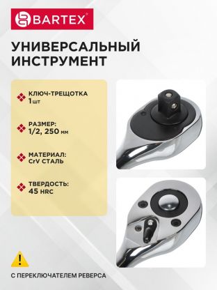 Ключ трещотка, Bartex, 250 мм, 1/2 '', CrV сталь, с переключателем